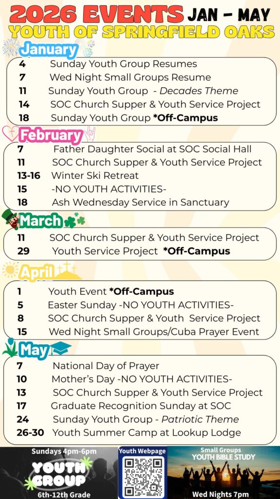 Each school year we require parents to submit updated information and permissions forms for our youth. If your child is new to youth they will need to bring the filled out forms with them. Print the form, 3 pages, complete and return to the Youth Director or church office.
